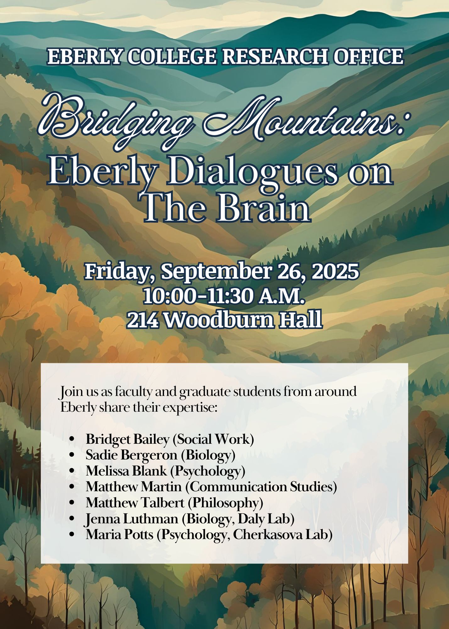 The Bridging Mountains series brings together faculty from across Eberly College to represent different disciplines' approaches and share their own research on a given topic. Each faculty speaker gives a 5-minute mini-talk on their work. Faculty, students, and staff are all welcome to attend!