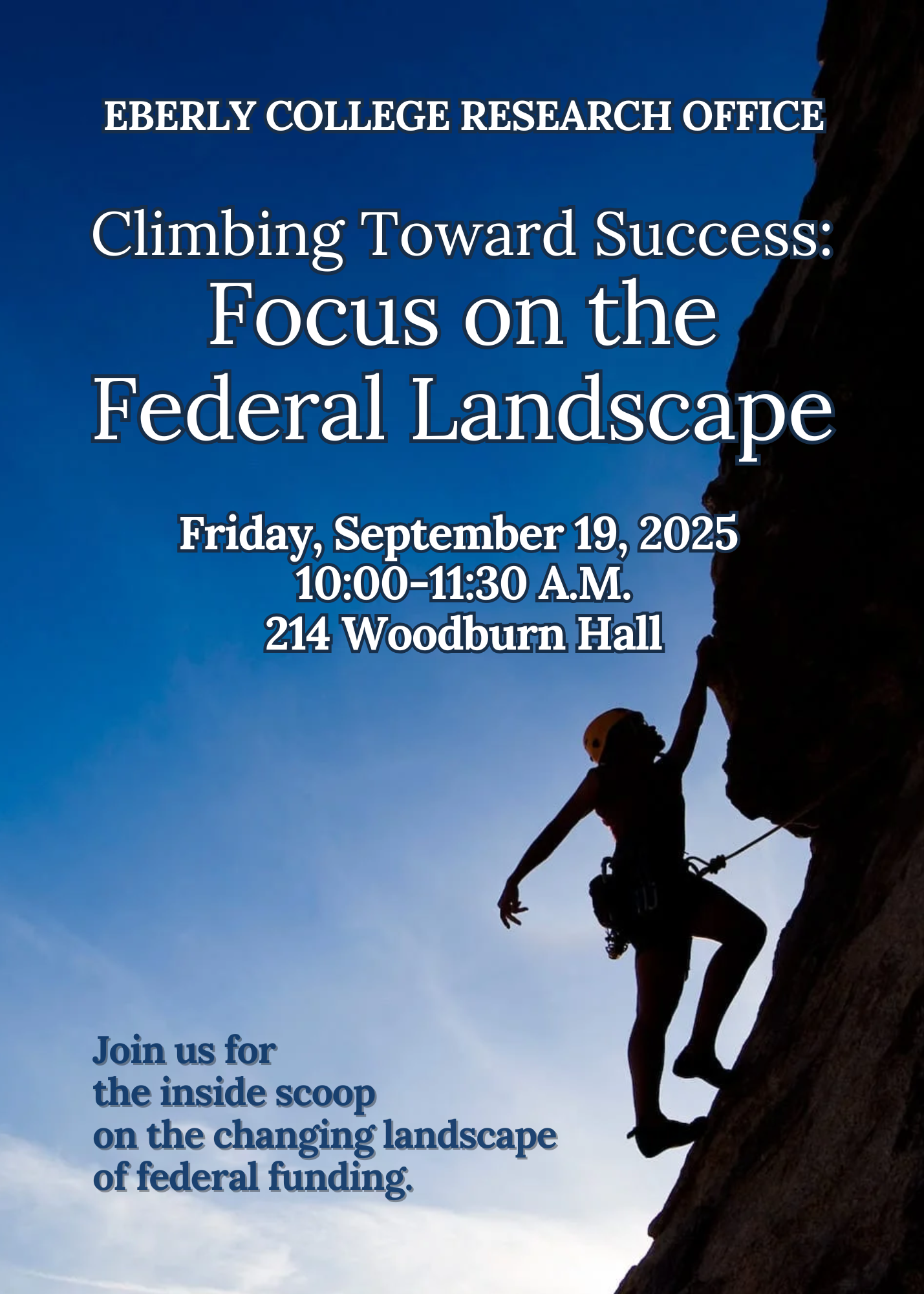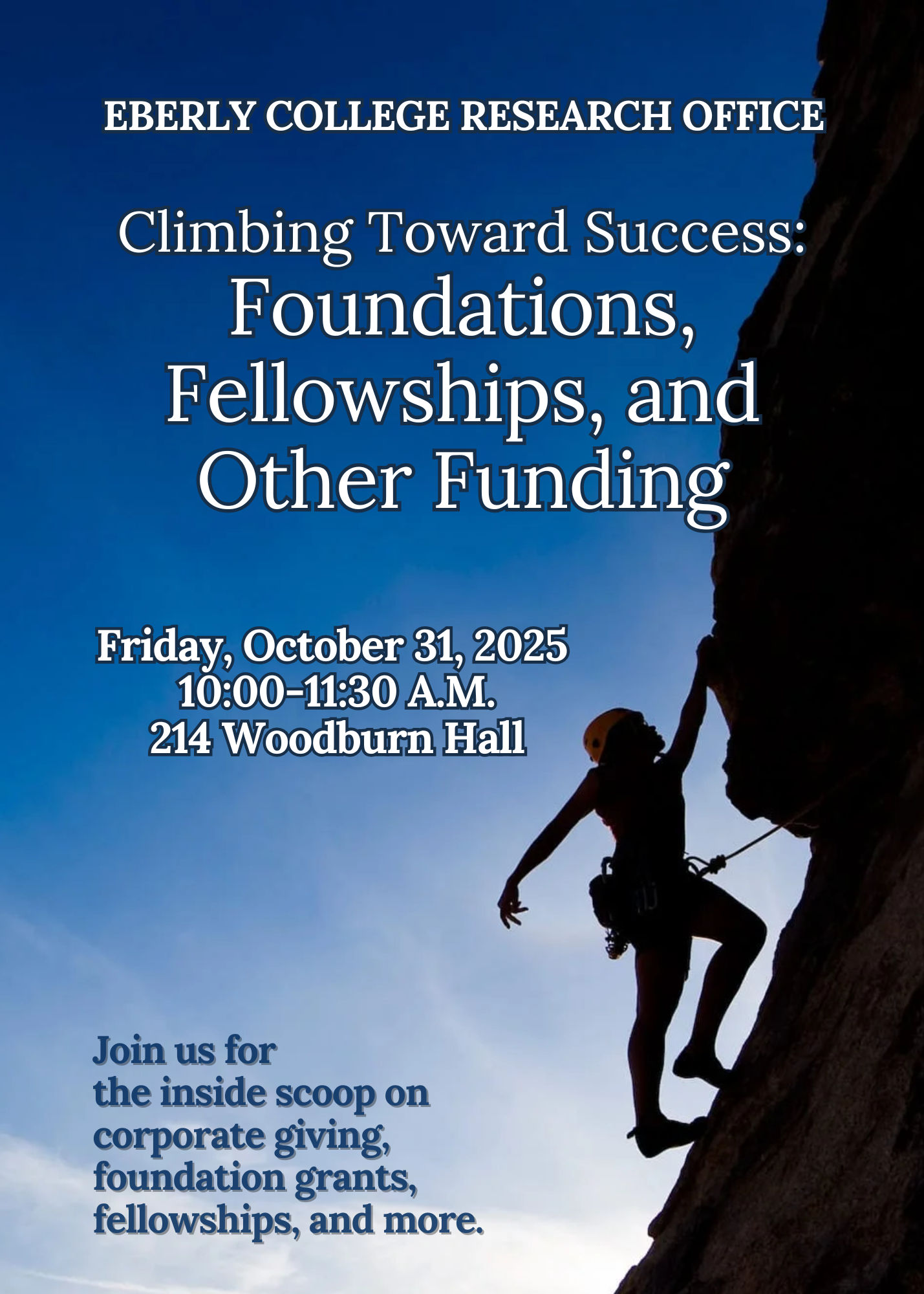 The new Climbing Toward Success lecture series will provide insight from the Eberly College Research Office staff and provide Eberly faculty with information and tools to compete in the current grant-seeking and grant-making landscape.